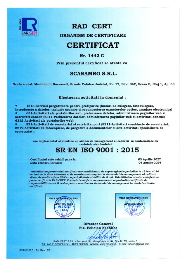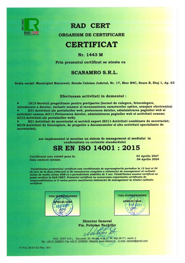 SC SCANAMRO SRL este o societate certificată ISO 9001 și ISO 14001, ce oferă servicii premium de scanare a documentelor, garantând cele mai înalte standarde de calitate și sustenabilitate.